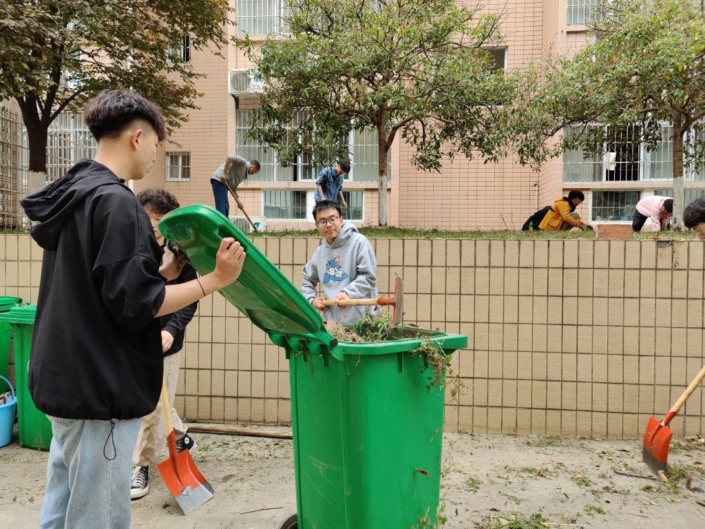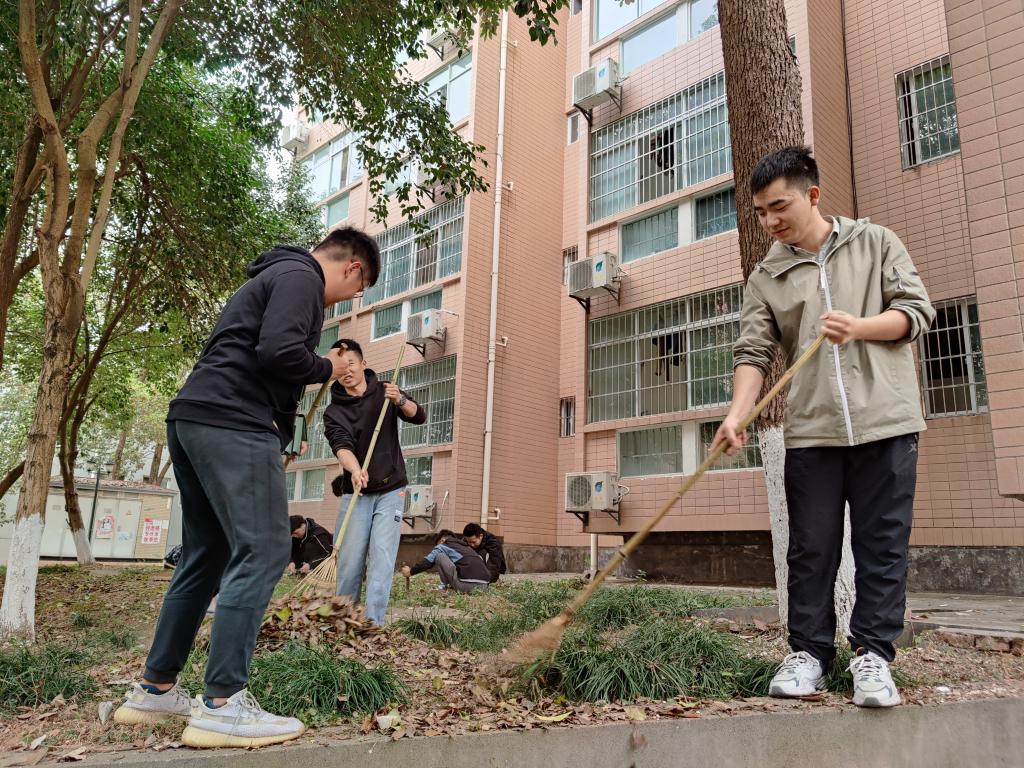 来自不同班级的同学们在系团总支、学生会及各班级负责人的带领下,分组分区域清扫散落在各处的落叶残枝,拾捡着星星点点的垃圾残骸。同学们有的戴着胶手套清理杂乱无章的干草,有的拿着树枝拨弄草丛中的枯叶,有的则铲除已清扫成堆的垃圾……各小组在打扫的过程中充分发挥团结互助的精神,分工明确,紧密合作,使打扫工作的效率大大提升。