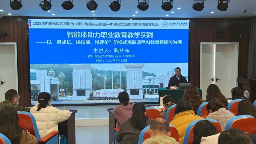 2026年3月15日,在四川省教师培训市(州)统筹实施项目——B1课程实施能力提升培训专项班上,我院建筑工程学院副院长陶庆东老师应邀授课,为泸州市中职骨干教师作《智能体助力职业教育教学实践》专题讲座,聚焦提升教师课程实施能力,助力推动职业教育“三教”改革走深走实。